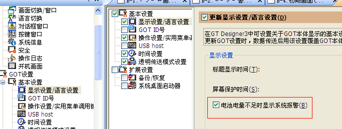 轉換好后,點軟件左邊的系統,GOT設置,顯示設置/語言設備,把電池電量不足的勾去掉。