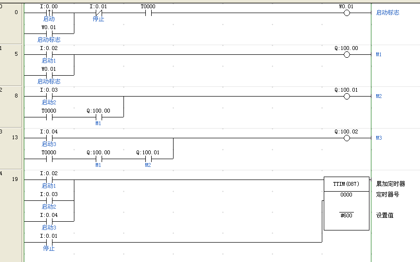 3個定時器分別記錄3臺電機的運行時間,1分鐘到后停止,即可實現