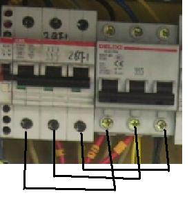 如圖,兩個斷路器分別接三相電,斷路器后如圖接法,同時對下面電路供電。