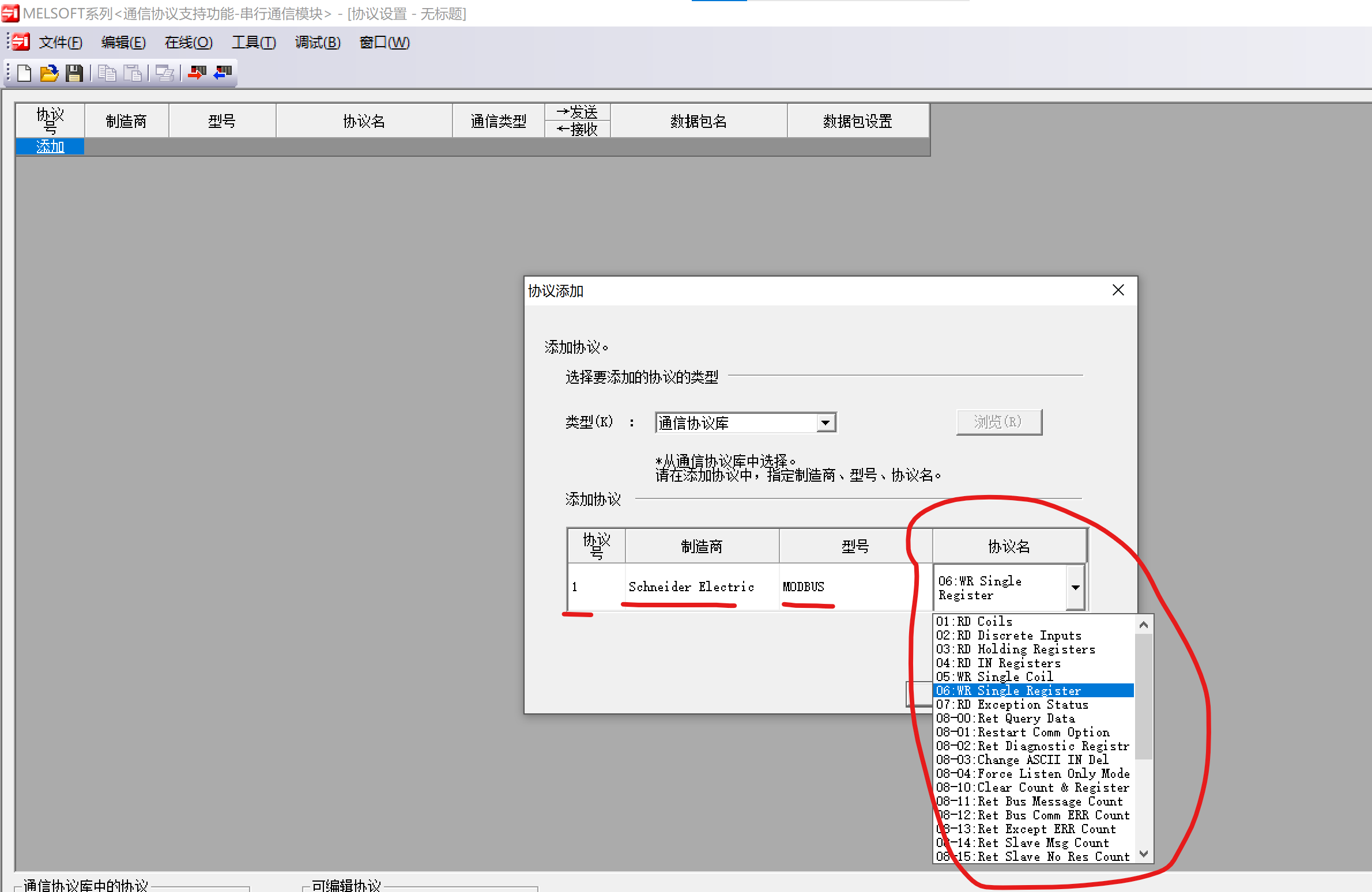 沒錯modbus,就選三菱已經集成的在制造商列表選擇施耐德 modbus,接著選擇你需要的功能碼 常用的03 06 功能碼等等多的很,注意可以添加多個協議號 到時候有相應的指令可以一起執行 添加后可以右擊批量修改寄存器配置。方便的很。