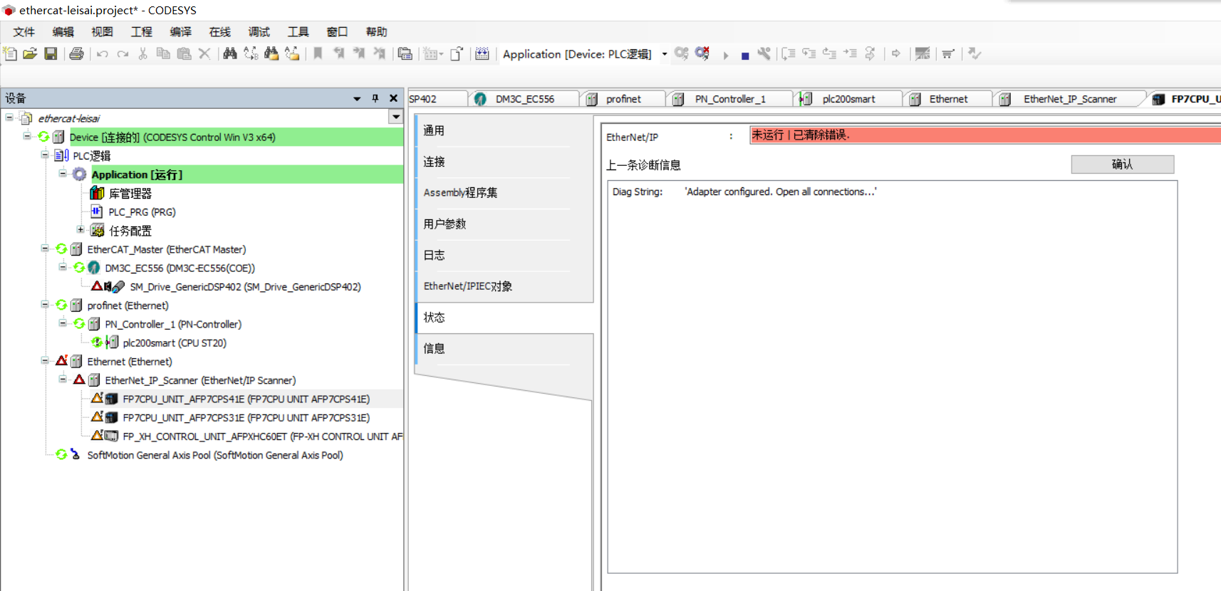 同時用了3中總線,ethercat,掃描添加雷賽EC556驅動器,profinet掃描200smart,Ethernet/ip掃描添加松下cpu,全部掃描的到,添加到工程后全部異常,是不是我沒設置好,設備描述文件都安裝好了
