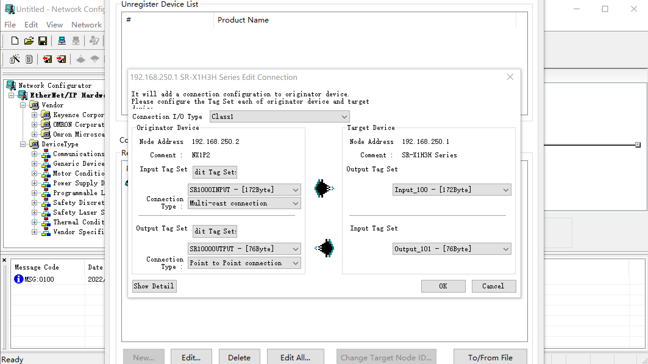 在Network Configurator for EtherNetIP里配置是這樣的,是不是如果不用Network Configurator for EtherNetIP配置,直接在軟件里配置 目標變量寫100 和101即可