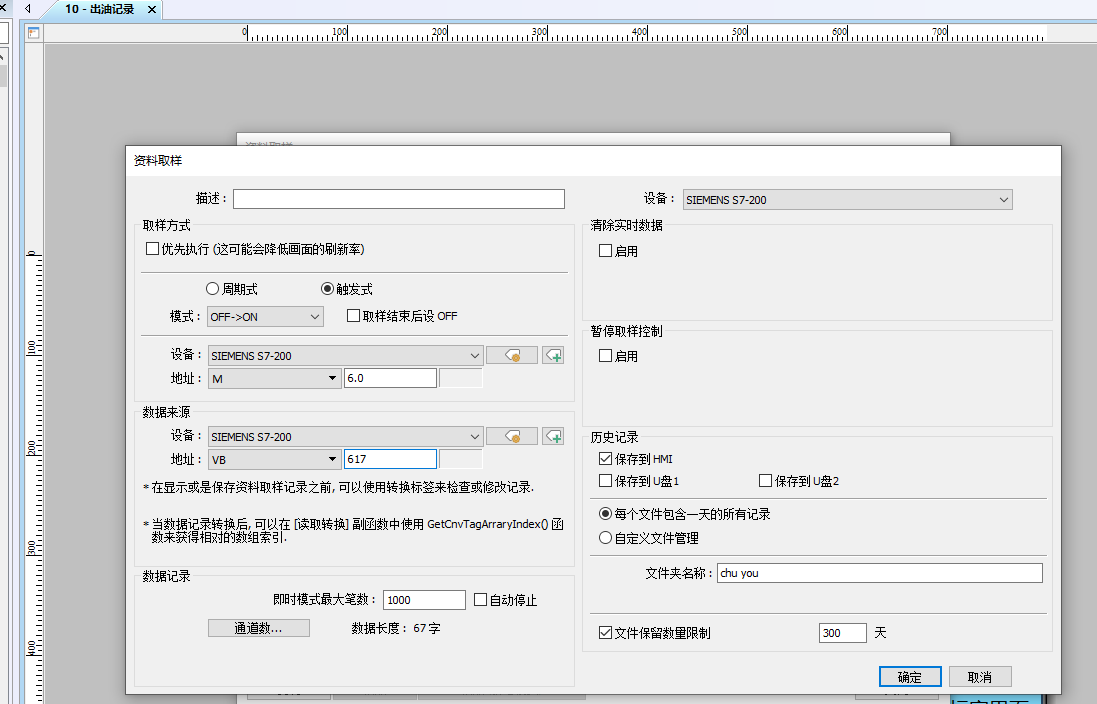 西門子PLC連接的掃描槍,掃碼數(shù)據(jù)存在VB617開始50個VB中,我在觸摸屏上新建資料取樣元件,觸發(fā)采樣以后,導(dǎo)出到U盤上,表格中只存儲了第一位2,后面的都沒有,如何讓威綸通一下可以存儲50位數(shù)據(jù),然后導(dǎo)出后表格能顯示出條碼來,現(xiàn)在就顯示第一位。。。他們說是這種數(shù)據(jù)需要用威綸通的宏程序,把PLC的這串50個字符宏程序轉(zhuǎn)成觸摸屏內(nèi)部存儲器,然后再進(jìn)行采樣,我也不懂這個,那位老師幫忙看下。謝謝